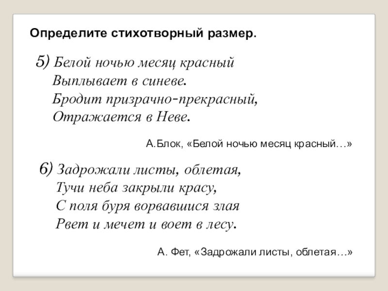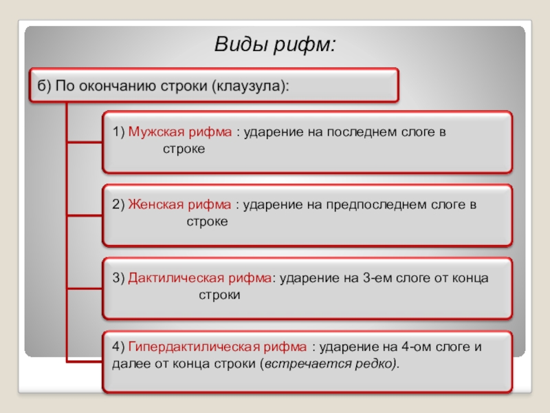 4) Гипердактилическая рифма : ударение на 4-ом слоге и далее от конца строки (встречается редко).