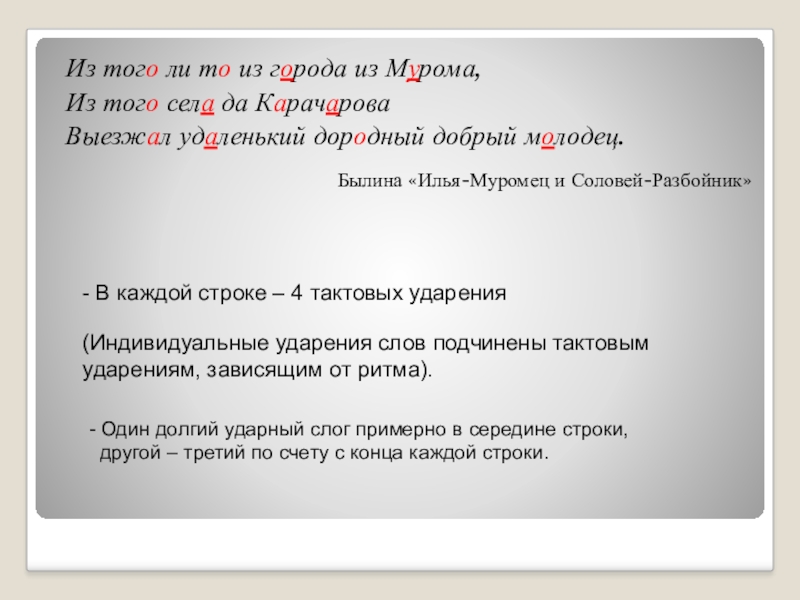 (Индивидуальные ударения слов подчинены тактовым ударениям, зависящим от ритма).