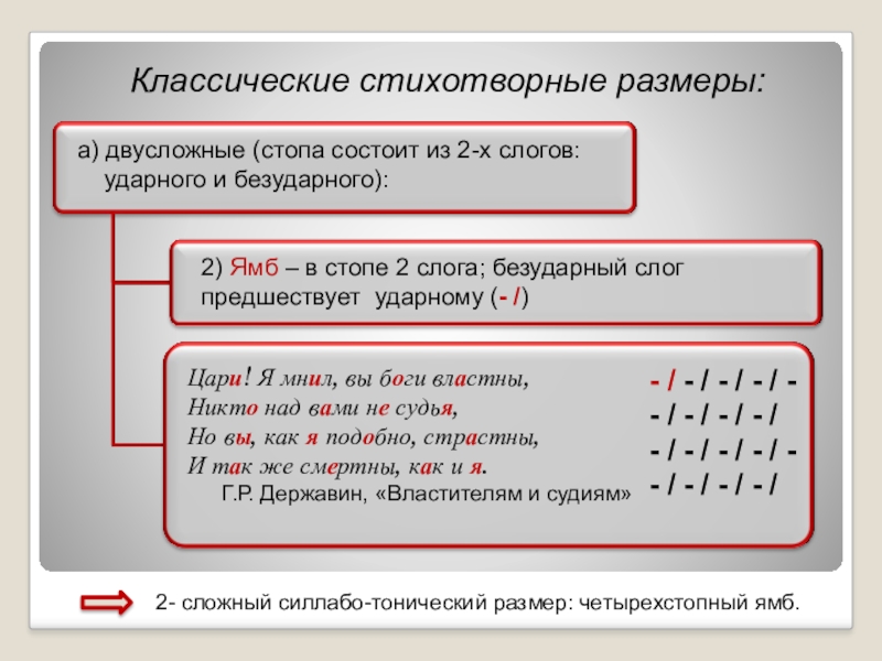 2) Ямб – в стопе 2 слога; безударный слог предшествует ударному (- /)