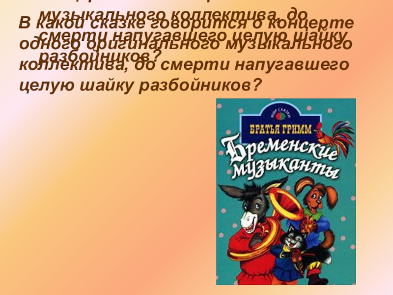 В какой сказке говорится о концерте одного оригинального музыкального коллектива, до смерти напугавшего целую шайку разбойников?