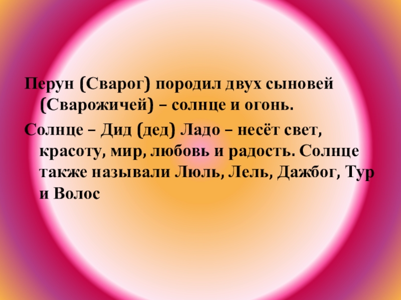 Слайд 18Перун (Сварог) породил двух сыновей (Сварожичей) – солнце и огонь.