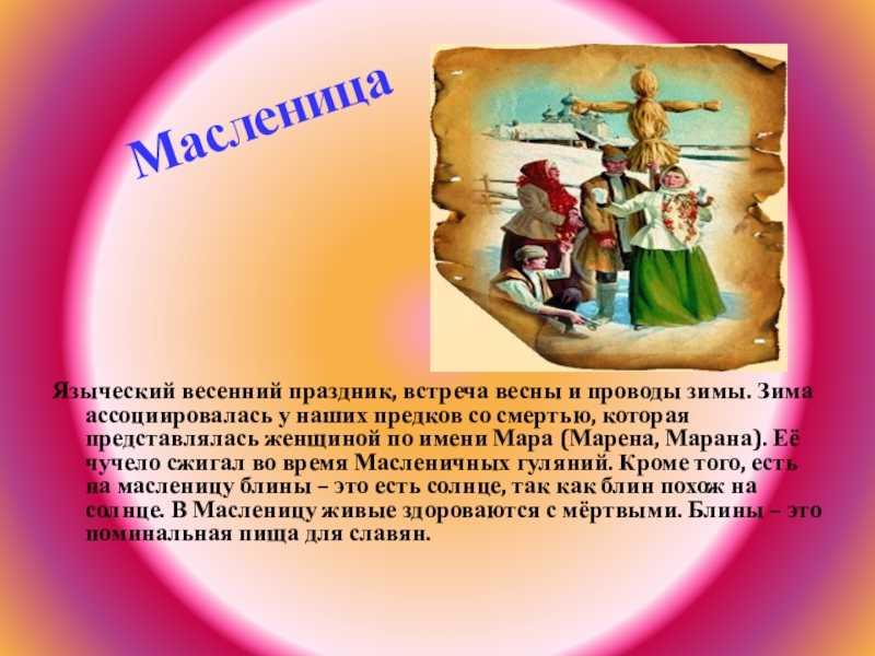 наших предков со смертью, которая представлялась женщиной по имени Мара (Марена, Марана). Её чучело сжигал во время Масленичных гуляний. Кроме того, есть на масленицу блины – это есть солнце, так как блин похож на солнце. В Масленицу живые здороваются с мёртвыми. Блины – это поминальная пища для славян.