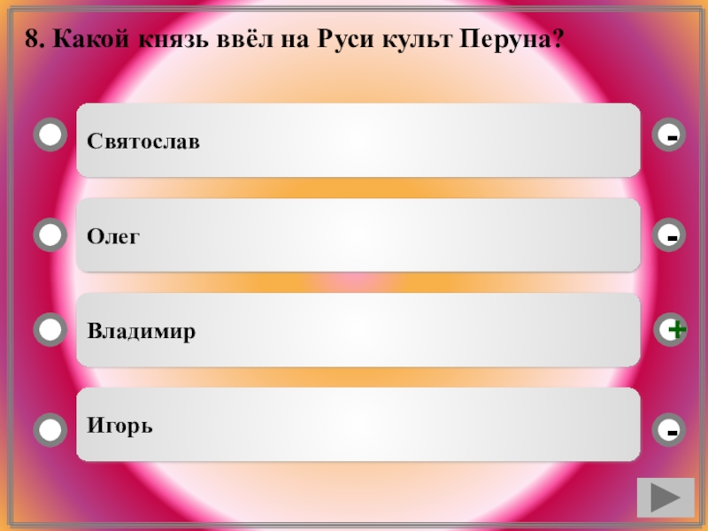 Слайд 378. Какой князь ввёл на Руси культ Перуна?