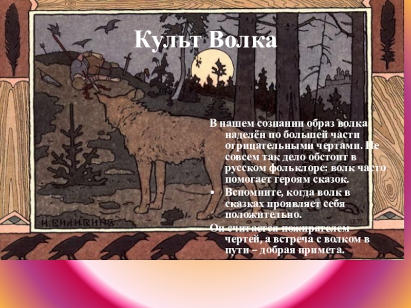 чертами. Не совсем так дело обстоит в русском фольклоре: волк часто помогает героям сказок.