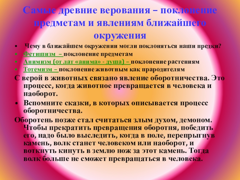 Слайд 4Самые древние верования – поклонение предметам и явлениям ближайшего окружения