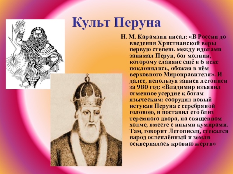 первую степень между идолами занимал Перун, бог молнии, которому славяне ещё в 6 веке поклонялись, обожая в нём верховного Мироправителя». И далее, используя записи летописи за 980 год: «Владимир изъявил отменное усердие к богам языческим: соорудил новый истукан Перуна с серебряной головою, и поставил его близ теремного двора, на священном холме, вместе с иными кумирами. Там, говорит Летописец, стекался народ ослеплённый и земля осквернялась кровию жертв»