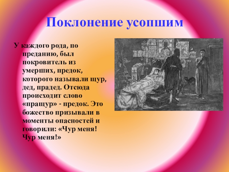 которого называли щур, дед, прадед. Отсюда происходит слово «пращур» - предок. Это божество призывали в моменты опасностей и говорили: «Чур меня! Чур меня!»