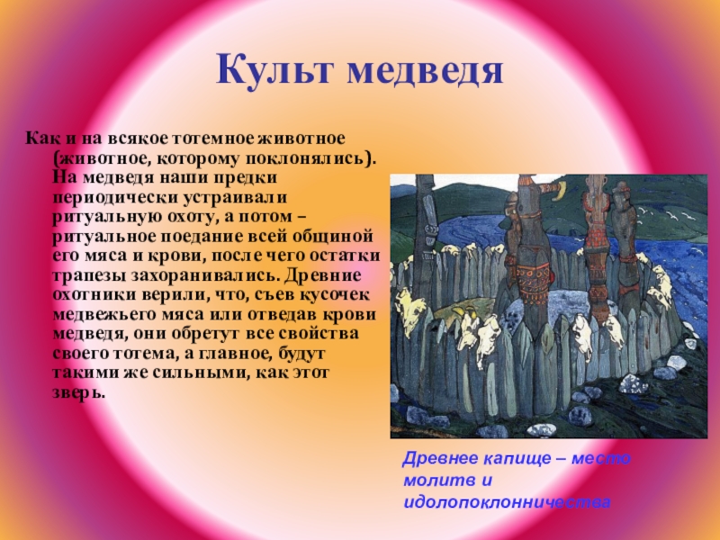медведя наши предки периодически устраивали ритуальную охоту, а потом – ритуальное поедание всей общиной его мяса и крови, после чего остатки трапезы захоранивались. Древние охотники верили, что, съев кусочек медвежьего мяса или отведав крови медведя, они обретут все свойства своего тотема, а главное, будут такими же сильными, как этот зверь.