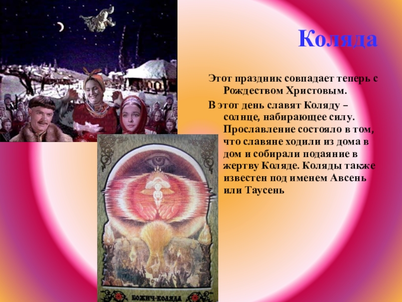 – солнце, набирающее силу. Прославление состояло в том, что славяне ходили из дома в дом и собирали подаяние в жертву Коляде. Коляды также известен под именем Авсень или Таусень
