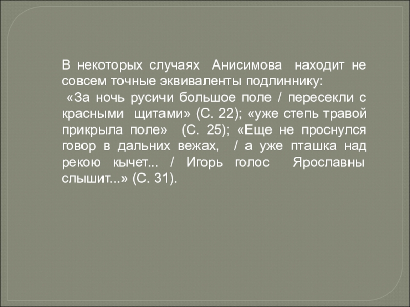 В некоторых случаях Анисимова находит не совсем точные эквиваленты подлиннику: