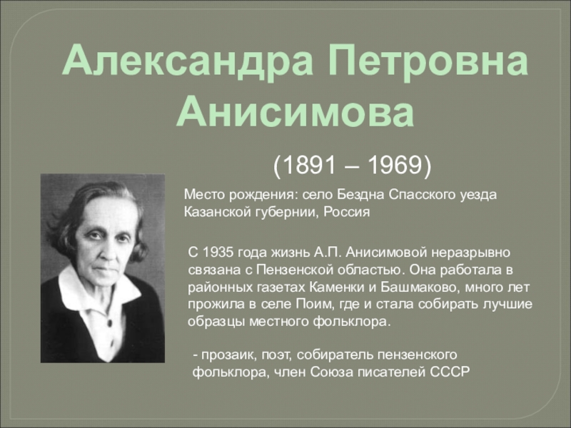С 1935 года жизнь А.П. Анисимовой неразрывно связана с Пензенской областью. Она работала в районных газетах Каменки и Башмаково, много лет прожила в селе Поим, где и стала собирать лучшие образцы местного фольклора.