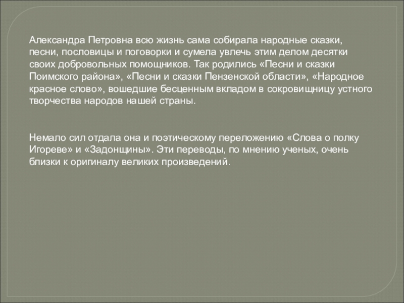 Слайд 17Александра Петровна всю жизнь сама собирала народные сказки, песни, пословицы и