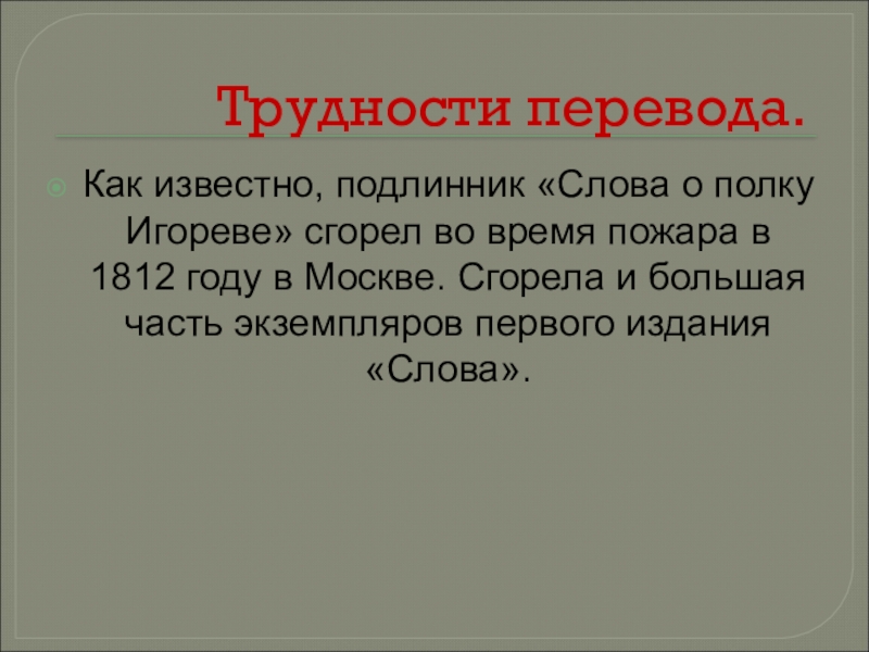 Как известно, подлинник «Слова о полку Игореве» сгорел во время