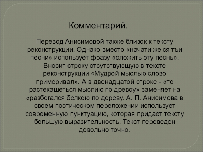 ся тъи песни» использует фразу «сложить эту песнь». Вносит строку отсутствующую в тексте реконструкции «Мудрой мыслью слово примеривал». А в двенадцатой строке - «то растекашеться мыслию по древоу» заменяет на «разбегался белкою по дереву. А. П. Анисимова в своем поэтическом переложении использует современную пунктуацию, которая придает тексту большую выразительность. Текст переведен довольно точно.