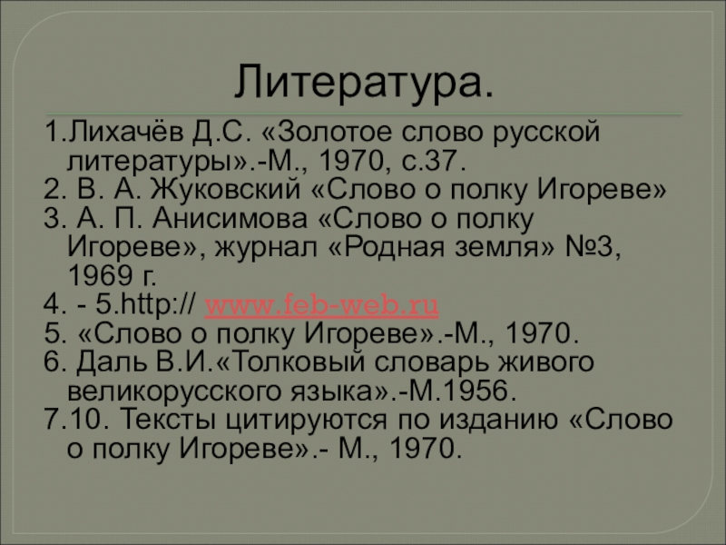 1.Лихачёв Д.С. «Золотое слово русской литературы».-М., 1970, с.37.