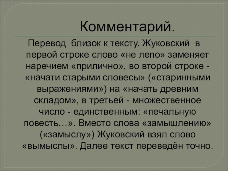 в первой строке слово «не лепо» заменяет наречием «прилично», во второй строке - «начати старыми словесы» («старинными выражениями») на «начать древним складом», в третьей - множественное число - единственным: «печальную повесть…». Вместо слова «замышлению» («замыслу») Жуковский взял слово «вымыслы». Далее текст переведён точно.
