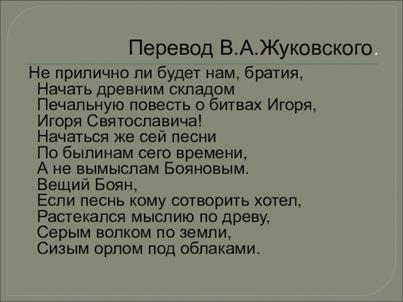 Перевод Жуковского отражает понимание древнерусского текста «Слова..». Начала XIX
