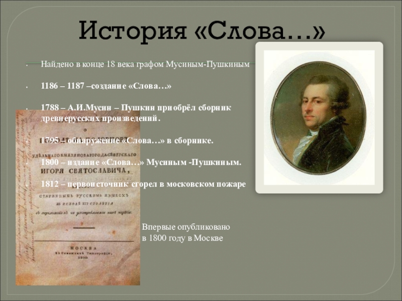 1800 – издание «Слова…» Мусиным -Пушкиным.