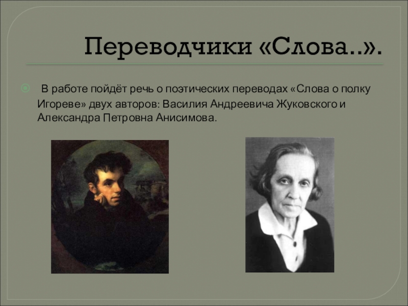 «Слова о полку Игореве» двух авторов: Василия Андреевича Жуковского и Александра Петровна Анисимова.