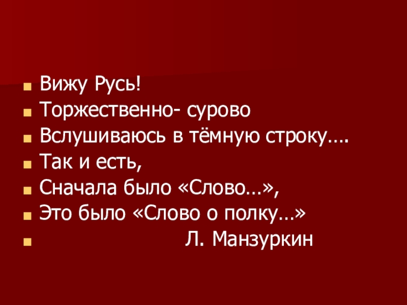 Вижу Русь!Торжественно- суровоВслушиваюсь в тёмную строку….Так и есть,Сначала было «Слово…»,Это было «Слово о полку…»