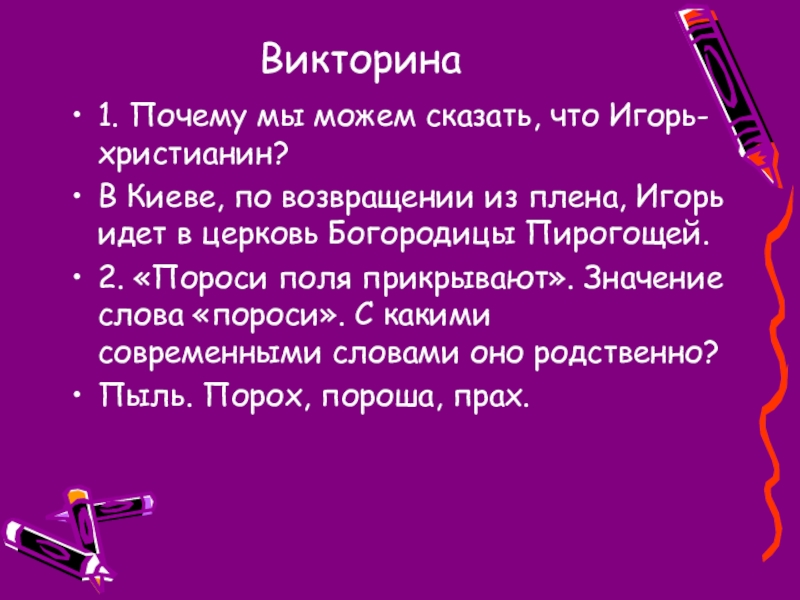 Викторина1. Почему мы можем сказать, что Игорь- христианин?В Киеве, по возвращении из плена, Игорь идет в церковь