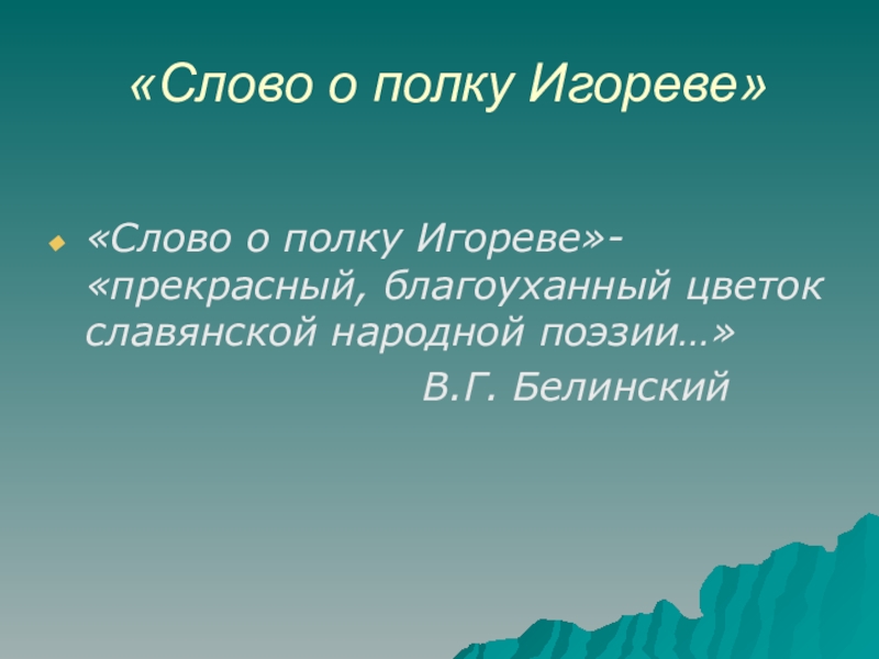«Слово о полку Игореве»«Слово о полку Игореве»- «прекрасный, благоуханный цветок славянской народной поэзии…» В.Г. Белинский