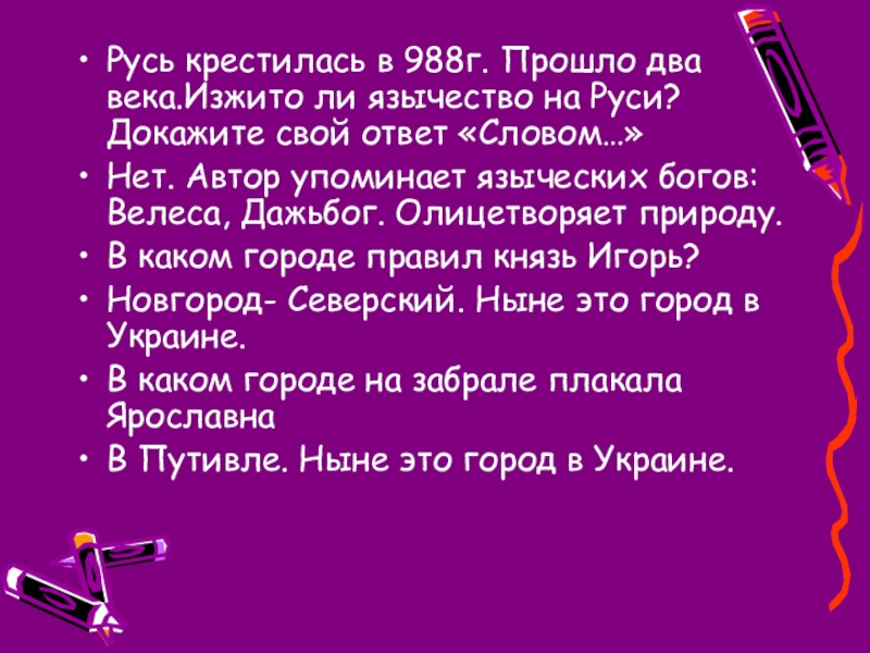 Русь крестилась в 988г. Прошло два века.Изжито ли язычество на Руси? Докажите свой ответ «Словом…»Нет. Автор упоминает