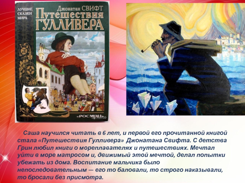 прочитанной книгой стала «Путешествия Гулливера» Джонатана Свифта. С детства Грин любил книги о мореплавателях и путешествиях. Мечтал уйти в море матросом и, движимый этой мечтой, делал попытки убежать из дома. Воспитание мальчика было непоследовательным — его то баловали, то строго наказывали, то бросали без присмотра.