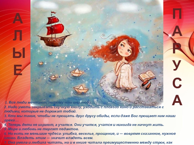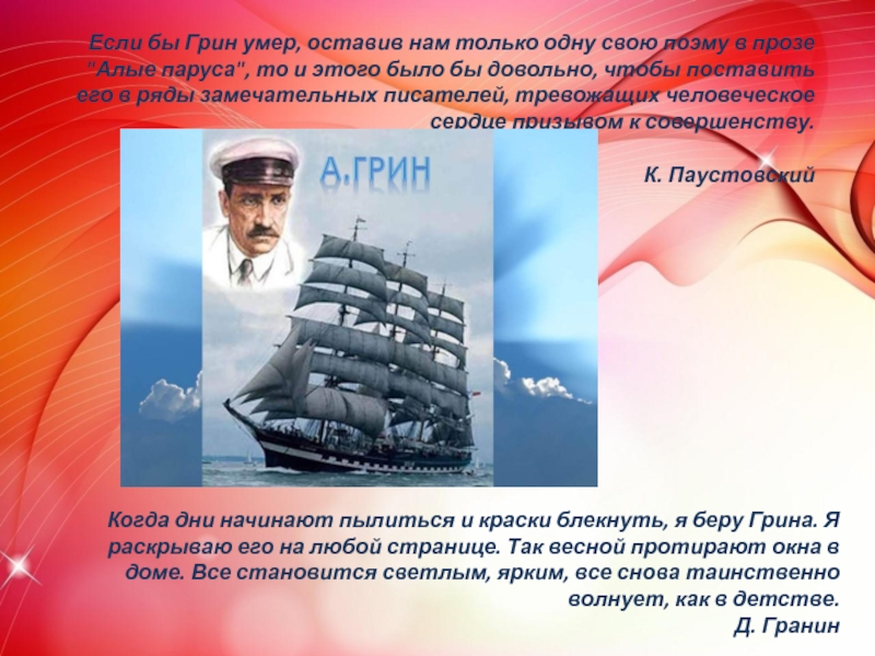 прозе "Алые паруса", то и этого было бы довольно, чтобы поставить его в ряды замечательных писателей, тревожащих человеческое сердце призывом к совершенству.