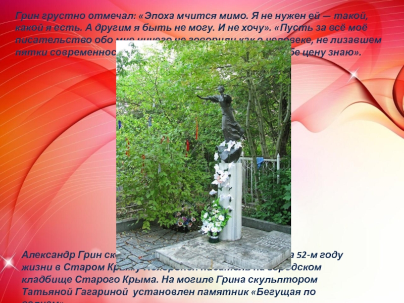 Александр Грин скончался утром 8 июля 1932 года на 52-м году жизни в Старом Крыму Похоронен писатель на городском кладбище Старого Крыма. На могиле Грина скульптором Татьяной Гагариной установлен памятник «Бегущая по волнам».