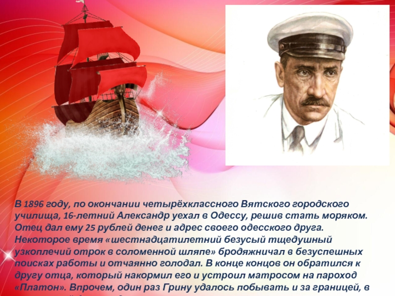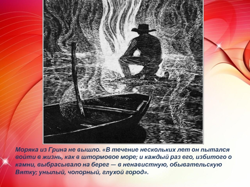 Слайд 10Моряка из Грина не вышло. «В течение нескольких лет он пытался