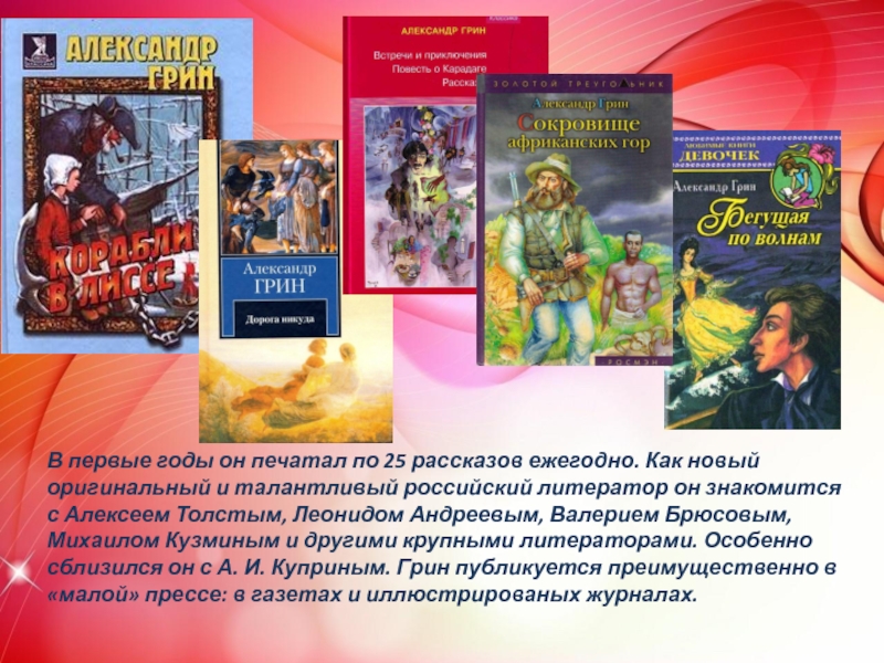 оригинальный и талантливый российский литератор он знакомится с Алексеем Толстым, Леонидом Андреевым, Валерием Брюсовым, Михаилом Кузминым и другими крупными литераторами. Особенно сблизился он с А. И. Куприным. Грин публикуется преимущественно в «малой» прессе: в газетах и иллюстрированых журналах.