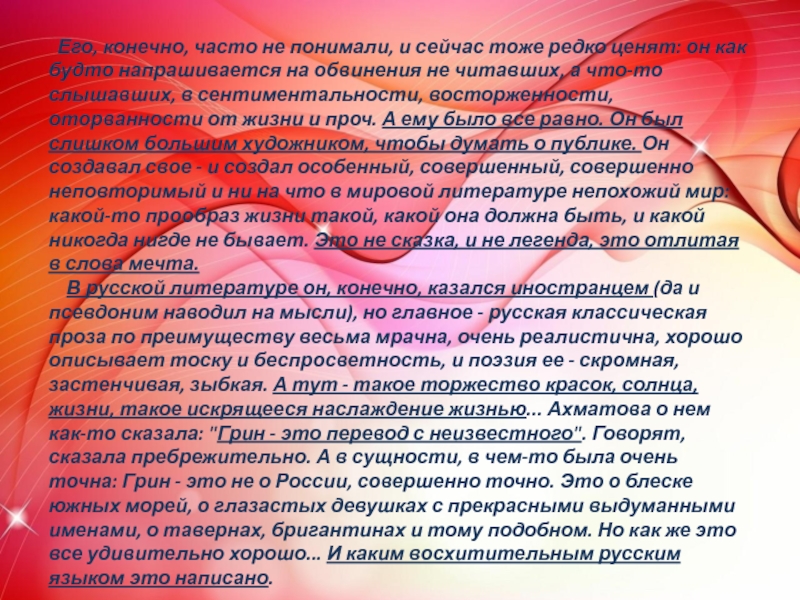 В русской литературе он, конечно, казался иностранцем (да и псевдоним наводил на мысли), но главное - русская классическая проза по преимуществу весьма мрачна, очень реалистична, хорошо описывает тоску и беспросветность, и поэзия ее - скромная, застенчивая, зыбкая. А тут - такое торжество красок, солнца, жизни, такое искрящееся наслаждение жизнью... Ахматова о нем как-то сказала: "Грин - это перевод с неизвестного". Говорят, сказала пребрежительно. А в сущности, в чем-то была очень точна: Грин - это не о России, совершенно точно. Это о блеске южных морей, о глазастых девушках с прекрасными выдуманными именами, о тавернах, бригантинах и тому подобном. Но как же это все удивительно хорошо... И каким восхитительным русским языком это написано.