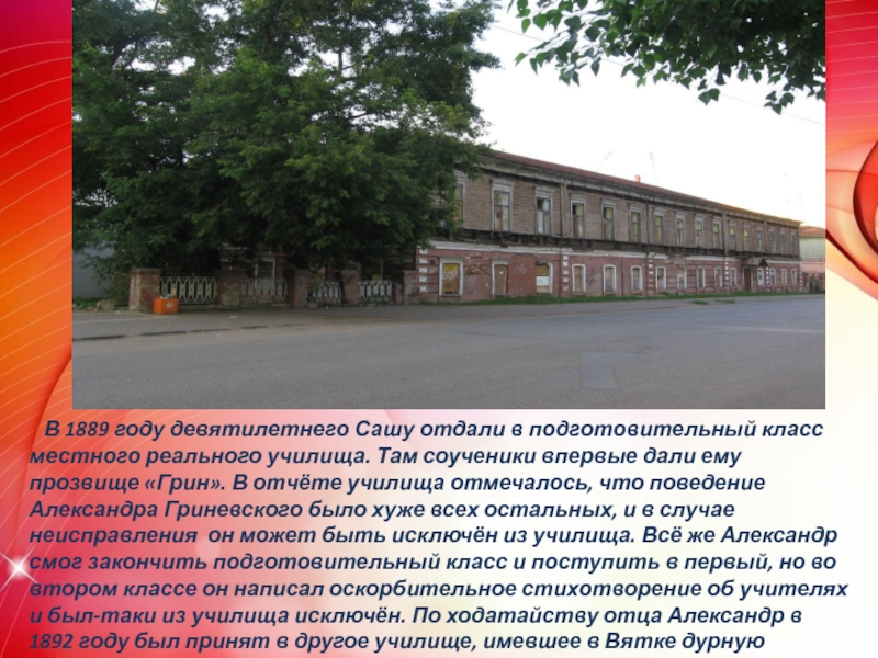 местного реального училища. Там соученики впервые дали ему прозвище «Грин». В отчёте училища отмечалось, что поведение Александра Гриневского было хуже всех остальных, и в случае неисправления он может быть исключён из училища. Всё же Александр смог закончить подготовительный класс и поступить в первый, но во втором классе он написал оскорбительное стихотворение об учителях и был-таки из училища исключён. По ходатайству отца Александр в 1892 году был принят в другое училище, имевшее в Вятке дурную репутацию.