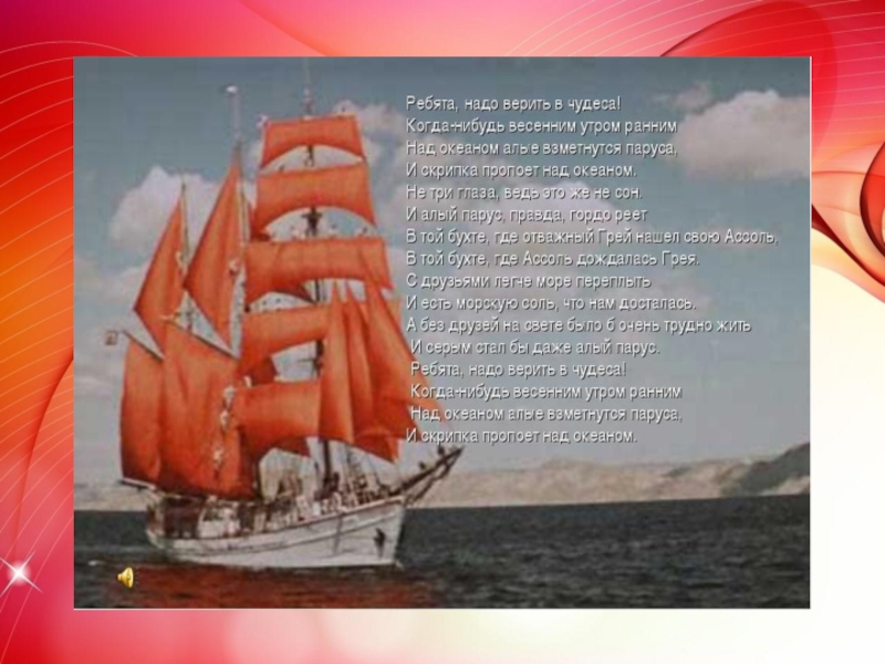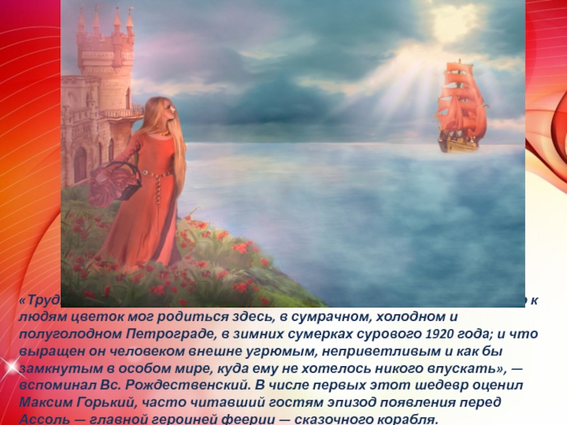 мог родиться здесь, в сумрачном, холодном и полуголодном Петрограде, в зимних сумерках сурового 1920 года; и что выращен он человеком внешне угрюмым, неприветливым и как бы замкнутым в особом мире, куда ему не хотелось никого впускать», — вспоминал Вс. Рождественский. В числе первых этот шедевр оценил Максим Горький, часто читавший гостям эпизод появления перед Ассоль — главной героиней феерии — сказочного корабля.