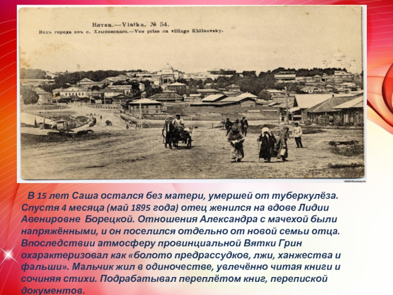 туберкулёза. Спустя 4 месяца (май 1895 года) отец женился на вдове Лидии Авенировне Борецкой. Отношения Александра с мачехой были напряжёнными, и он поселился отдельно от новой семьи отца. Впоследствии атмосферу провинциальной Вятки Грин охарактеризовал как «болото предрассудков, лжи, ханжества и фальши». Мальчик жил в одиночестве, увлечённо читая книги и сочиняя стихи. Подрабатывал переплётом книг, перепиской документов.