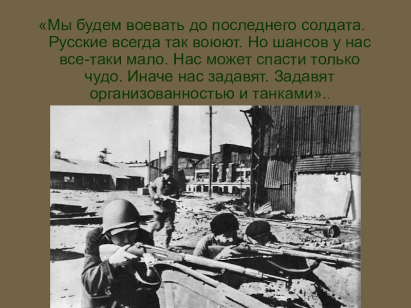 шансов у нас все-таки мало. Нас может спасти только чудо. Иначе нас задавят. Задавят организованностью и танками»..