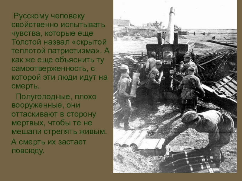 еще Толстой назвал «скрытой теплотой патриотизма». А как же еще объяснить ту самоотверженность, с которой эти люди идут на смерть.