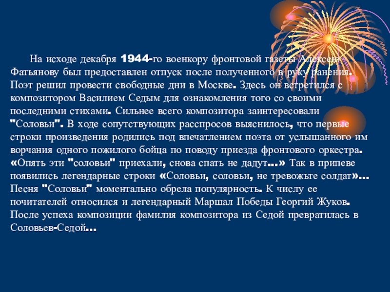 Слайд 20На исходе декабря 1944-го военкору фронтовой газеты Алексею Фатьянову был предоставлен