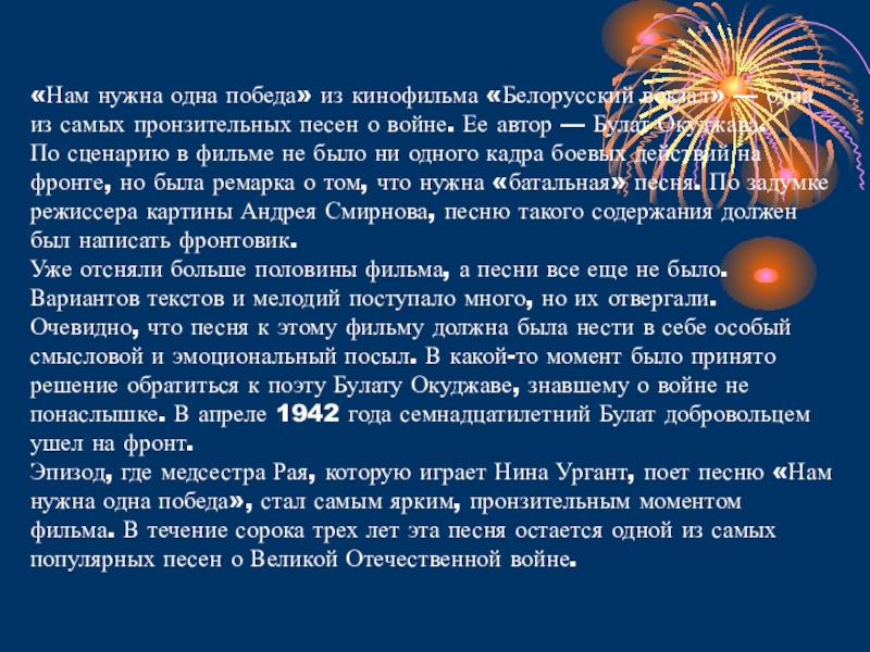 Слайд 27«Нам нужна одна победа» из кинофильма «Белорусский вокзал» — одна из
