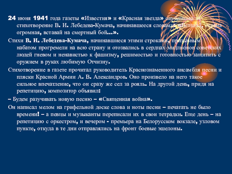 В. И. Лебедева-Кумача, начинавшееся словами: «Вставай, страна огромная, вставай на смертный бой...».