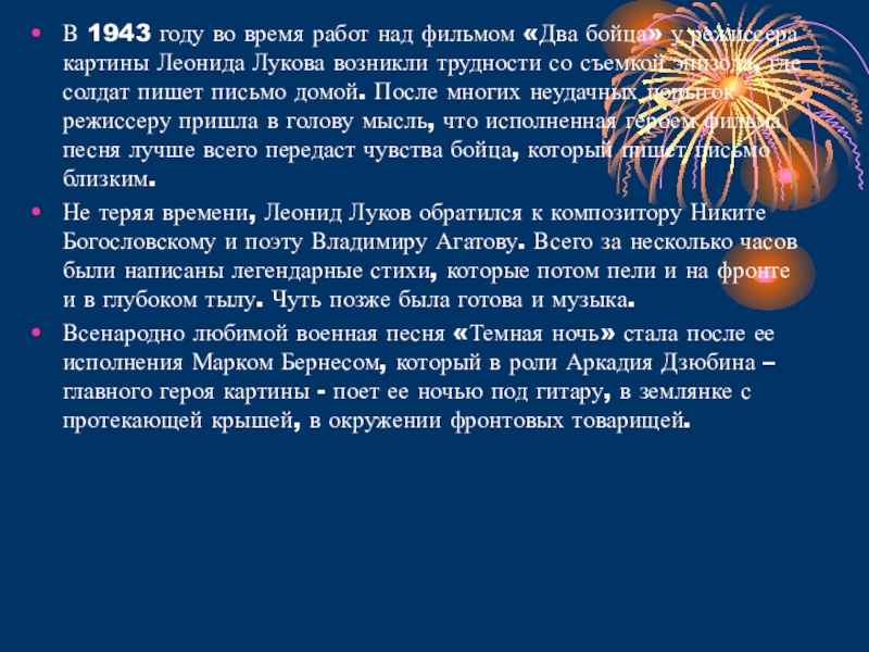 Всенародно любимой военная песня «Темная ночь» стала после ее исполнения Марком Бернесом, который в роли Аркадия Дзюбина – главного героя картины - поет ее ночью под гитару, в землянке с протекающей крышей, в окружении фронтовых товарищей.