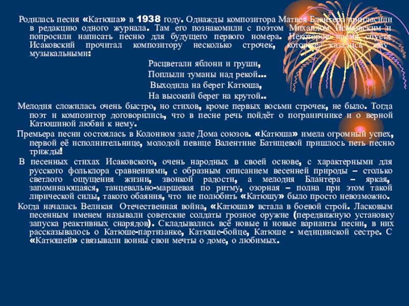 Слайд 14 Родилась песня «Катюша» в 1938 году. Однажды композитора Матвея Блантера