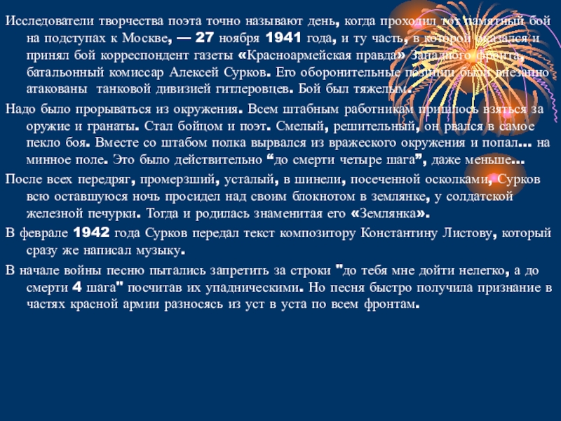 на подступах к Москве, — 27 ноября 1941 года, и ту часть, в которой оказался и принял бой корреспондент газеты «Красноармейская правда» Западного фронта, батальонный комиссар Алексей Сурков. Его оборонительные позиции были внезапно атакованы танковой дивизией гитлеровцев. Бой был тяжелым.