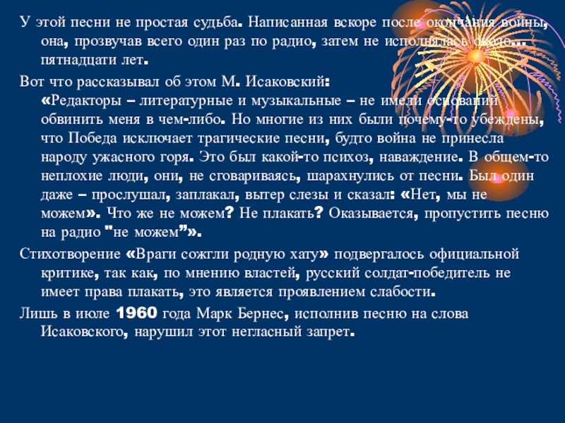Слайд 18У этой песни не простая судьба. Написанная вскоре после окончания войны,