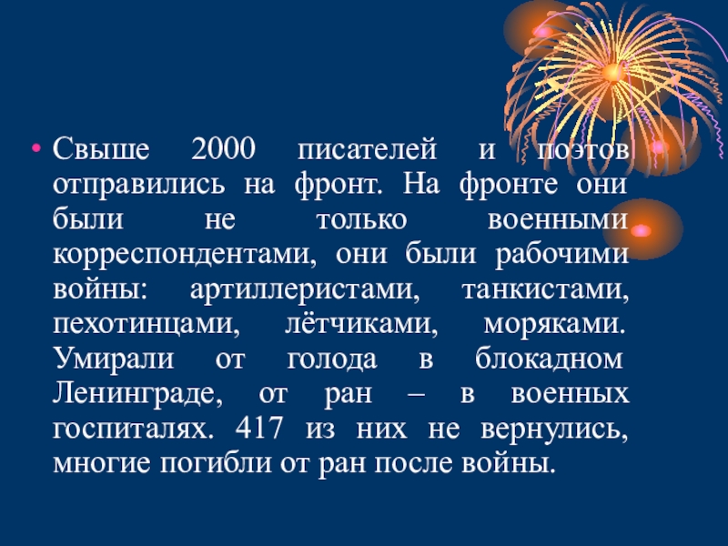 Слайд 5Свыше 2000 писателей и поэтов отправились на фронт. На фронте они
