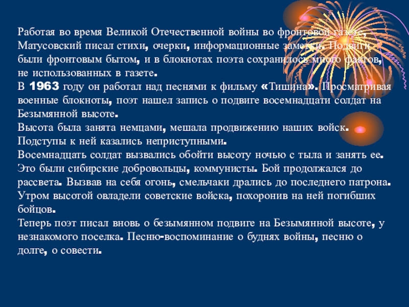 Слайд 25Работая во время Великой Отечественной войны во фронтовой газете, Матусовский писал
