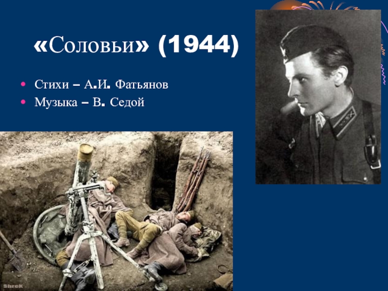 отпуск после полученного в руку ранения. Поэт решил провести свободные дни в Москве. Здесь он встретился с композитором Василием Седым для ознакомления того со своими последними стихами. Сильнее всего композитора заинтересовали "Соловьи". В ходе сопутствующих расспросов выяснилось, что первые строки произведения родились под впечатлением поэта от услышанного им ворчания одного пожилого бойца по поводу приезда фронтового оркестра. «Опять эти "соловьи" приехали, снова спать не дадут...» Так в припеве появились легендарные строки «Соловьи, соловьи, не тревожьте солдат»…