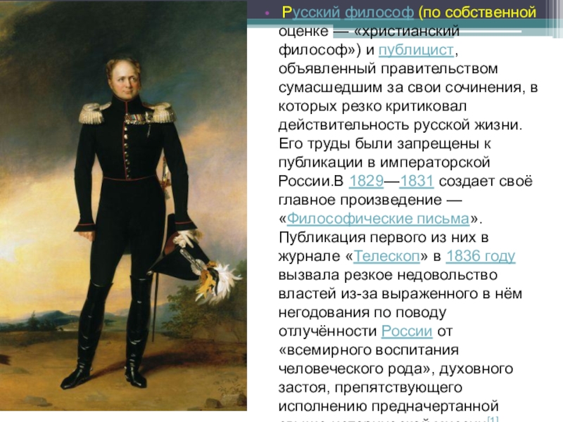 сочинения, в которых резко критиковал действительность русской жизни. Его труды были запрещены к публикации в императорской России.В 1829—1831 создает своё главное произведение — «Философические письма». Публикация первого из них в журнале «Телескоп» в 1836 году вызвала резкое недовольство властей из-за выраженного в нём негодования по поводу отлучённости России от «всемирного воспитания человеческого рода», духовного застоя, препятствующего исполнению предначертанной свыше исторической миссии[1]. Журнал был закрыт, издатель Надеждин сослан, а Чаадаев — объявлен сумасшедшим.