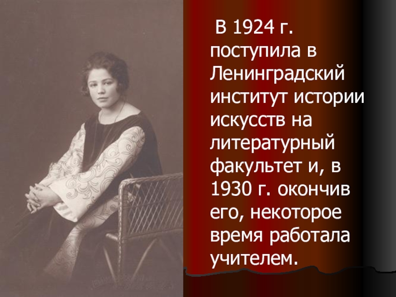 Слайд 4 В 1924 г. поступила в Ленинградский институт истории искусств на литературный